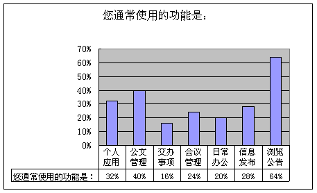 在少(shao)數的使用中心OA系統的人(ren)當中,大多是人(ren)瀏覽(lan)電(dian)子公(gong)告,其他功(gong)能的應用都非(fei)常少(shao),而(er)實(shi)際上,電(dian)子公(gong)告也已經將近(jin)半年沒有更新了(le);