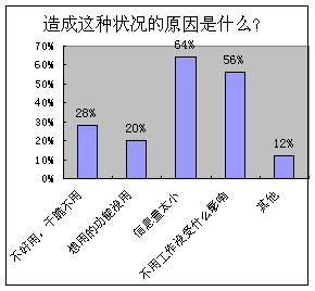 “信息量太小”、“不用工作也沒受什么影響”是造成這種現狀的最主要原因。當然了,沒人用自然信息量小,信息量小自然也就沒人用。這不是最根本的原因。而“不用工作也沒受什么影響”確實非常重要,它說明中心目前還沒有建立起OA系統與員工工作之間的聯系。沒有必然的聯系,當然也就沒有使用它的必要性了。但是,隨著中心人員規模的不斷擴大,不使用OA對工作效率帶來的影響將會越來越大。