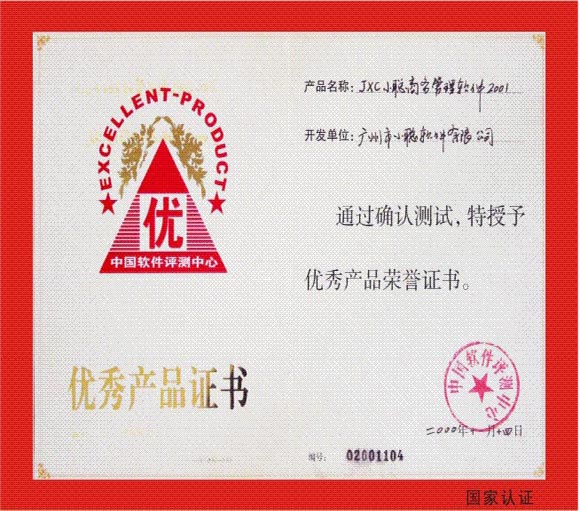 2000年11月14日“JXC小聰商務管理軟件”獲中國軟件評測中心認證為“中國優秀商務軟件”,并授予優秀產品榮譽證書
