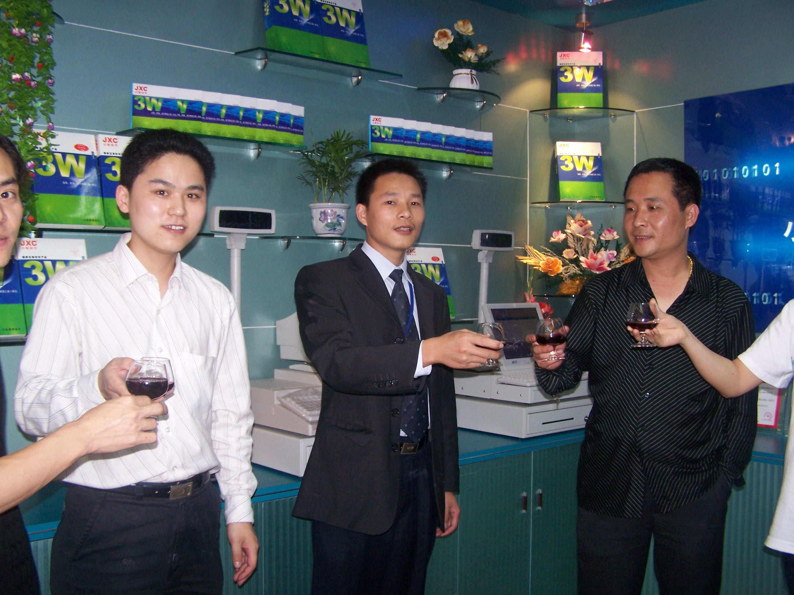 開香檳慶祝、小聰(cong)軟件(jian)總公司代表祝賀汕尾專賣店開業成功(gong)、生意興隆