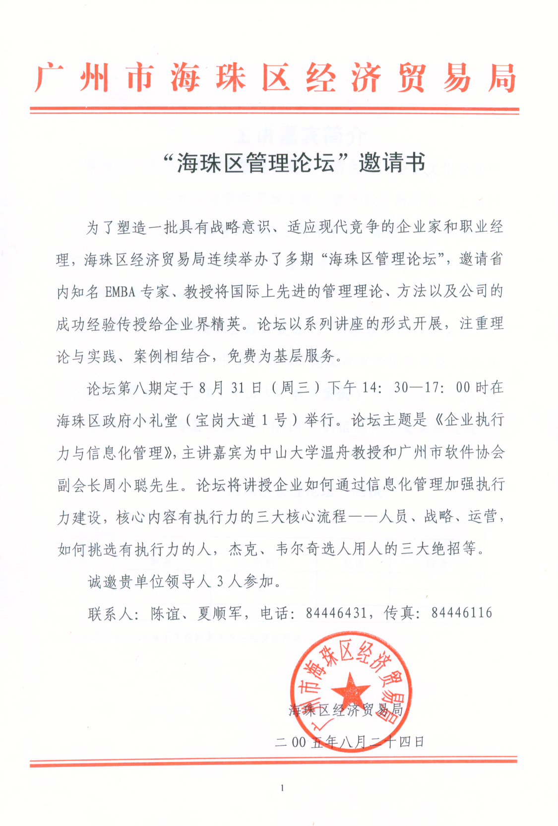 8月31日下午14:30-17:00在海珠區政府小禮堂舉行"企業執行力與信息化管理"論壇,你想學習國際上先進的管理理論、方法及經驗嗎?想知道企業如何通過信息化管理加強執行力建設嗎?答案就在其中。
