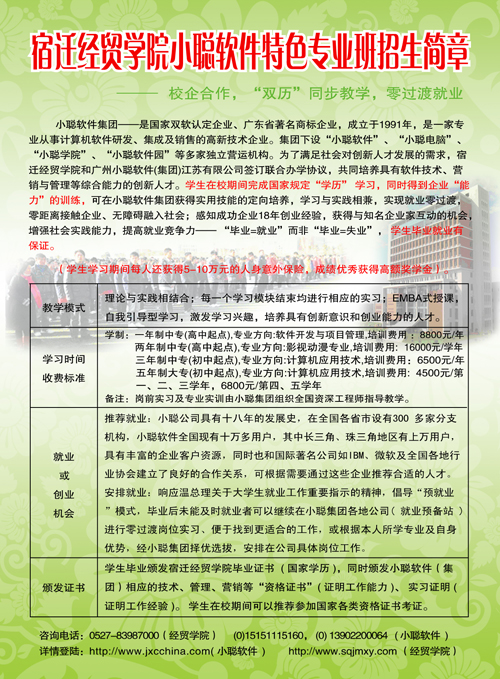 小聰軟件集團——是國家雙軟認定企業、廣東省著名商標企業。成立于1991年,是一家專業從事計算機軟件研發、集成及銷售的高新技術企業。集團下設“小聰軟件”、“小聰電腦”、“小聰學院”、“小聰軟件園”等多家獨立營運機構。為了滿足社會對創新人才發展的需求,江蘇省宿遷經貿學院和廣州小聰軟件(集團)江蘇有限公司簽訂聯合辦學協議,共同培養具有軟件技術、營銷與管理等綜合能力的創新型人才。學生在校期間完成國家規定“學歷”學習,同時得到企業“能力”的訓練,可在小聰軟件集團獲得實用技能的定向培訓,學習與實踐相兼,實現就業零過渡,零距離接觸企業、無障礙融入社會;感知成功企業18年創業經驗,獲得與知名企業家互動的機會,增強社會實踐能力,提高就業競爭力—— “畢業=就業”而非“畢業=失業”。 學生畢業就業有保障。