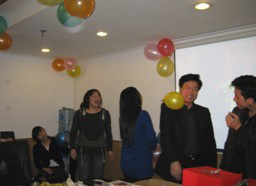 整個聯歡會又是一片歡樂的海洋,除了各部門的合唱外,有渠道總監的口琴演奏,有高歌嘹亮的《青藏高原》,有男女搭配的即興情景表演,還有可愛的《兩只老虎》表演等等。壓軸的自然是最后的抽獎環節,分設一二三等獎,抽到小獎的遺憾聲和抽到大獎的驚喜聲此起彼伏。