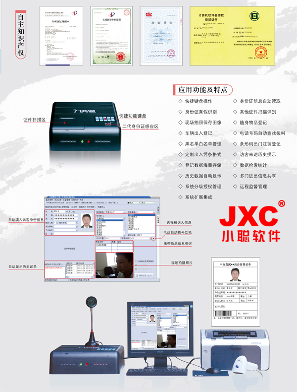 “JXC門務通”訪客登記系統充分利用現代化信息技術,真正做到人員、證件、照片三者統一。實現“進門登記、出門注銷、人像對應、隨身物品登記、分級管理、歷史記錄查詢、報表匯總”等功能。使用該系統后,通過人防和技防相結合,重點加強單位來訪賓客有序管理,提升單位門衛工作效率和服務品質。該系統廣泛應用于政府、企業、學校等人員往來登記的實時管理。