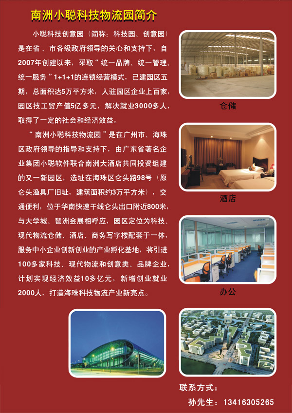 “南洲小聰科技(ji)物(wu)流(liu)(liu)園(yuan)”是在廣州市、海珠區政府領(ling)導的(de)指導和支(zhi)持下,由廣東省著名企(qi)業(ye)(ye)(ye)集(ji)團小聰軟件聯(lian)合南洲大酒店共同投資組建的(de)又一(yi)新園(yuan)區,選址在海珠區侖(lun)(lun)頭路98號(原侖(lun)(lun)頭漁(yu)具(ju)廠舊址,建筑面積約3萬平方米),交通便利,位于華南快速干(gan)線侖(lun)(lun)頭出口(kou)附近800米,與大學城、琶洲會展相呼應,園(yuan)區定(ding)位為科技(ji)、現(xian)代物(wu)流(liu)(liu)倉儲、酒店和商務寫字樓配套于一(yi)體(ti),服務中小企(qi)業(ye)(ye)(ye)創新創業(ye)(ye)(ye)的(de)產業(ye)(ye)(ye)孵化(hua)基(ji)地,將引進100多家科技(ji)、現(xian)代物(wu)流(liu)(liu)和創意類(lei)、品牌企(qi)業(ye)(ye)(ye),計劃實現(xian)經濟(ji)效(xiao)益10多億元,新增創業(ye)(ye)(ye)就業(ye)(ye)(ye)2000人,打造海珠科技(ji)物(wu)流(liu)(liu)產業(ye)(ye)(ye)新亮(liang)點。