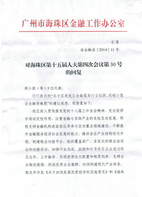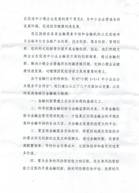 小聰1+1+1人大提案獲海珠區金融辦回復和指導