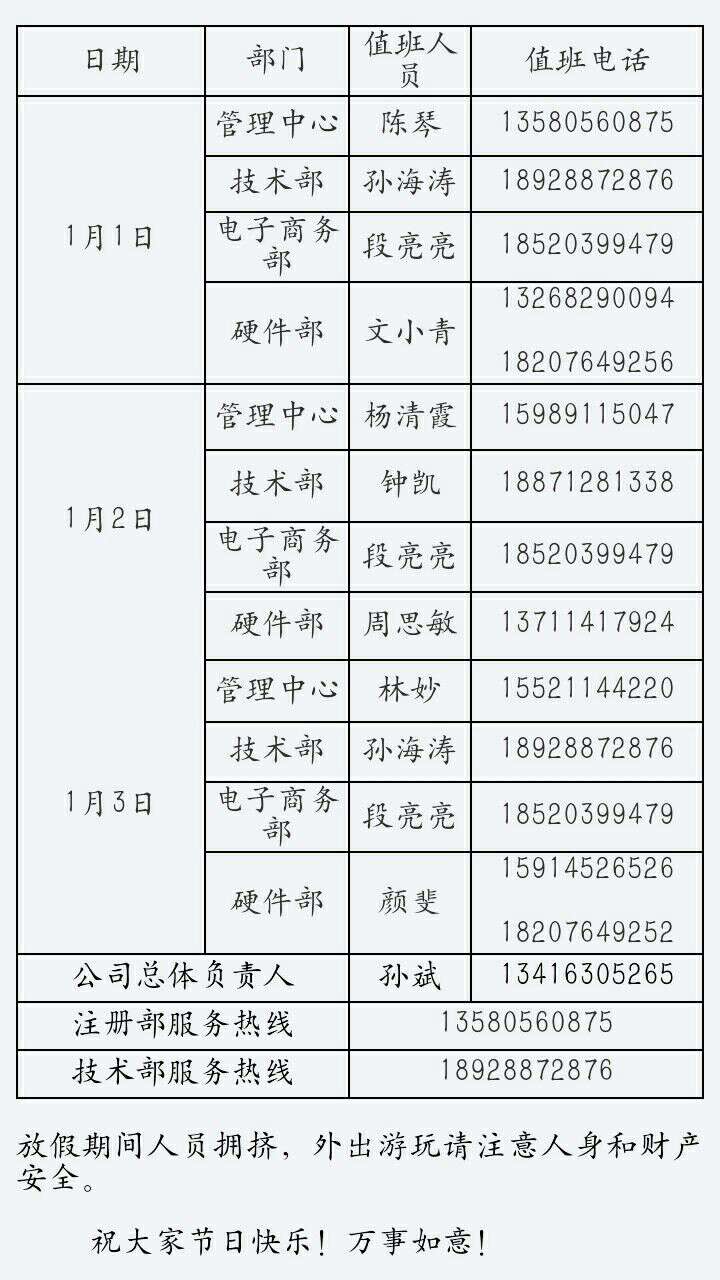 放假期間公司全體員工手機必須保持通訊正常,隨時待命和服從公司領導放假期間安排的工作,如遇緊急情況需要上門服務的,員工要以顧客需求為中心先為客戶提供服務,事后可向公司申請補休。各相關部門值班人員安排如下: