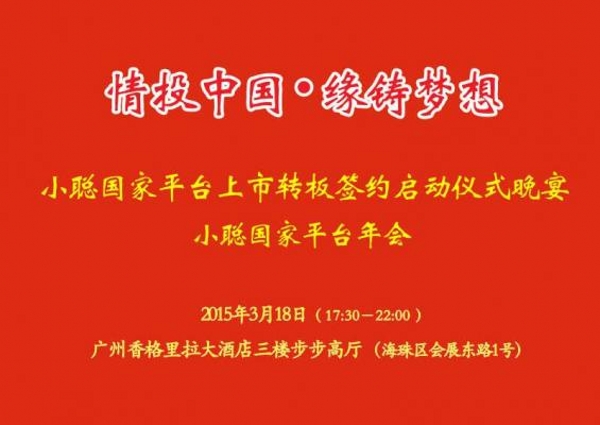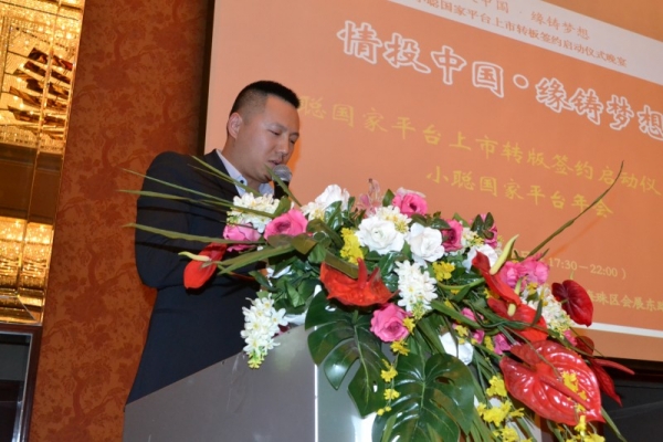 318日晚,小聰國家中小企業公共服務平臺轉板啟動儀式晚宴在廣州香格里拉國際大酒店隆重召開,國家平臺投資人、華工同學會李輝會長、廣東省電腦商會陳芝華會長 、廣東電視臺教育頻道余澤生董事長、中山大學嶺南學院關智生教授、國家平臺高級顧問韓世同先生、國信證券游崢琦女士、趙德鈺女士、國家平臺廣州情投基金主席、南軟集團董事長馬本湘先生、 國家平臺橫琴(港澳)基地主席、珠海橫琴廣投資有限公司董事韓小卡、換換網主席周柏年先生、合貸網董事長王華超先生、著名藝術家哲學家李正天教授、南方日報廣州新聞部主任姜玉龍先生、小聰國家平臺投資人易德集團董事長吳永輝先生、澳門心臟基金副主席、新合和董事長吳山平先生、獅盾陶瓷集團李青總裁、模豆網謝偉星總裁、應邀出席了晚宴,國家平臺主席、小聰軟件產業集團董事長周小聰先生向大家作了關于小聰情投國家平臺的報告,得到了大家的一致認同與共鳴。