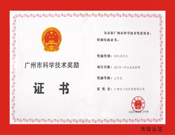 根據<<廣州市科學獎勵辦法>>的規定和廣州市科技局的推薦,去年納入海珠區2002年度科技計劃項目的JXC3W一體化系統軟件(廣州市小聰軟件公司)....被廣州市科技局評為2002年度廣州市科學技術獎。