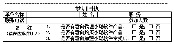 尊敬的_________,您好! 廣州市小聰軟件公司在茂名地區成功收購東方電腦有限公司后,注冊成立了小聰軟件茂名有限公司,宣布小聰軟件“登錄茂名”,合作是共贏的基礎,這是小聰軟件“1+1+1”領先概念的結果,同時也給茂名地區IT產業注入一股雄厚的新生力量,推動茂名地區高新技術、信息化的發展,現小聰軟件茂名有限公司定于2004年8月12日召開發布會,特邀您參與,屆時,你將了解: 小聰軟件“3W”一體化的概念 小聰產品 18個行業應用解決方案(小聰OA、小聰中望CAD、小聰 ERP、小聰手機行業版、小聰商場POS版……)、金蝶財務等 小聰軟件“1+1+1”國內首家領先概念 小聰POS設備、商用聯志服務器、萬成國家稅控等產品展示 享受免費升級、現場購買產品7折! 還有:精美禮品、抽獎活動。 華軍在線現場直播... ***************************************************************************************************** 誠摯邀請您撥冗蒞臨! 主辦單位:廣州市小聰軟件總公司 廣州市小聰軟件茂名分公司 協辦單位:廣州市軟件行業協會 茂名市科技局 華軍軟件園 擬邀請領導嘉賓單位:廣州市科技局、廣州市軟件行業協會、深圳科技信息局、 茂名市人民政府、電白縣人民政府 特邀嘉賓:陳小敏(2000悉尼奧運會女子舉重冠軍) 擬報道媒體:廣州日報、新快報、電腦商情報、中國計算機報、電腦報、南方報、茂名日報 會議時間:2004年8月12日下午2:30--5:30時 會議地點:茂名市光華南路163號中英大酒店23樓會議廳 聯系電話:廣州小聰總部 020-84349089 李先生、茂名小聰軟件 0668-2950636 劉先生 請詳細填寫回執,并請于8月11日前將回執EMAIL或傳真至上述地點,我們將為您作出滿意安排, 憑回執發放精美禮品和抽獎。