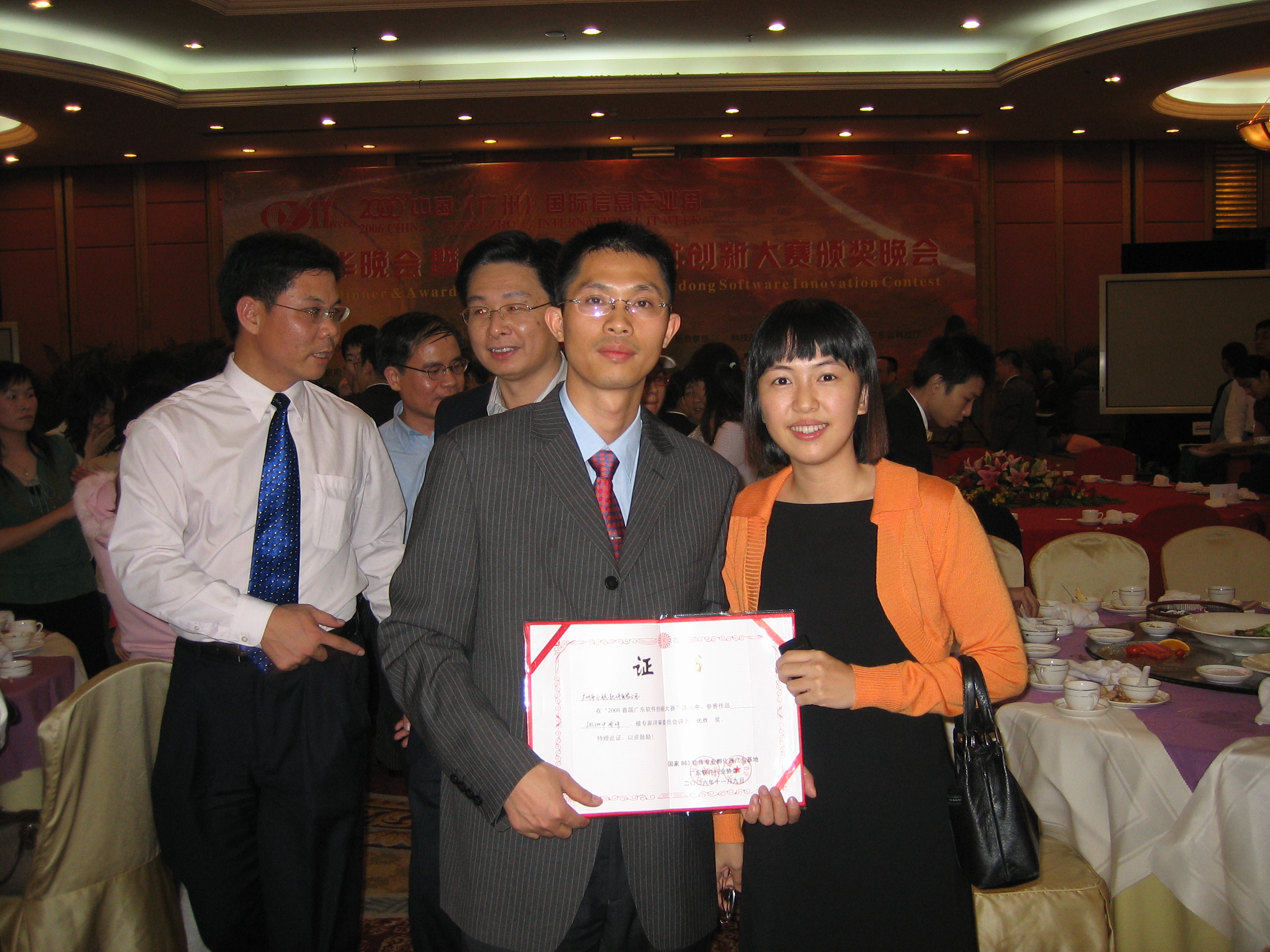 119在亞洲國際大酒店舉行了2006中國[廣州]國際信息產業周嘉年華暨首屆廣東軟件創新大賽頒獎晚會,國家、省、市領導、中國行業軟件網、廣東省信息產(chan)業廳、廣州市信息化辦公室領導以及全國IT業的專家代表出席了此次頒獎晚會。在此次創新大賽中廣州市小聰軟件有限公司的“JXC3W中間件”,經專家評審委員會認定,獲得了國家863廣東首屆軟件創新大賽優勝獎。