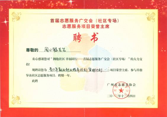 2011年12月4日,在首屆志愿服務廣交會上,廣州市志愿者協會為小聰軟件董事長周小聰先生頒發了志愿服務項目榮譽主席聘書,聘請周小聰為“青少年就業指導規劃宣講計劃”項目榮譽主席,參與并指導該志愿服務項目。