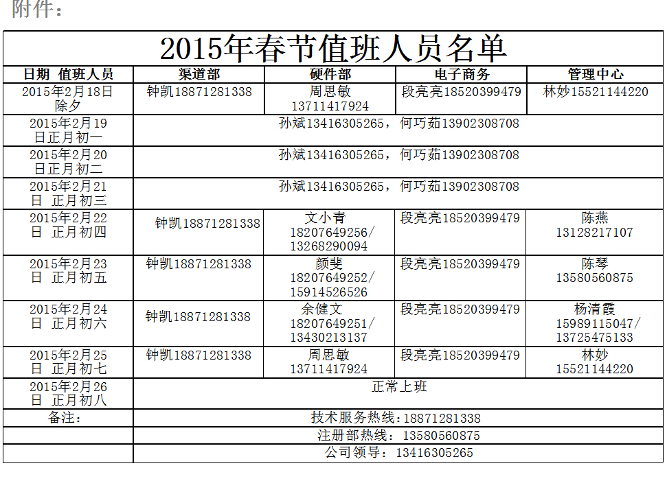 三、春節值班:春節期間實行電話值班制度(春節至大年初三期間為領導電話值班,其他時間為各部門成員電話值班),具體安排如下(見附件)