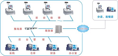 下圖為系統的架構圖。除了便捷的前臺POS功能,還有更加強大的后臺進貨、銷售、倉庫、查詢等功能,還可以通過internet網絡實現遠程傳輸功能,可管理遠在異地的分店、連鎖店等。